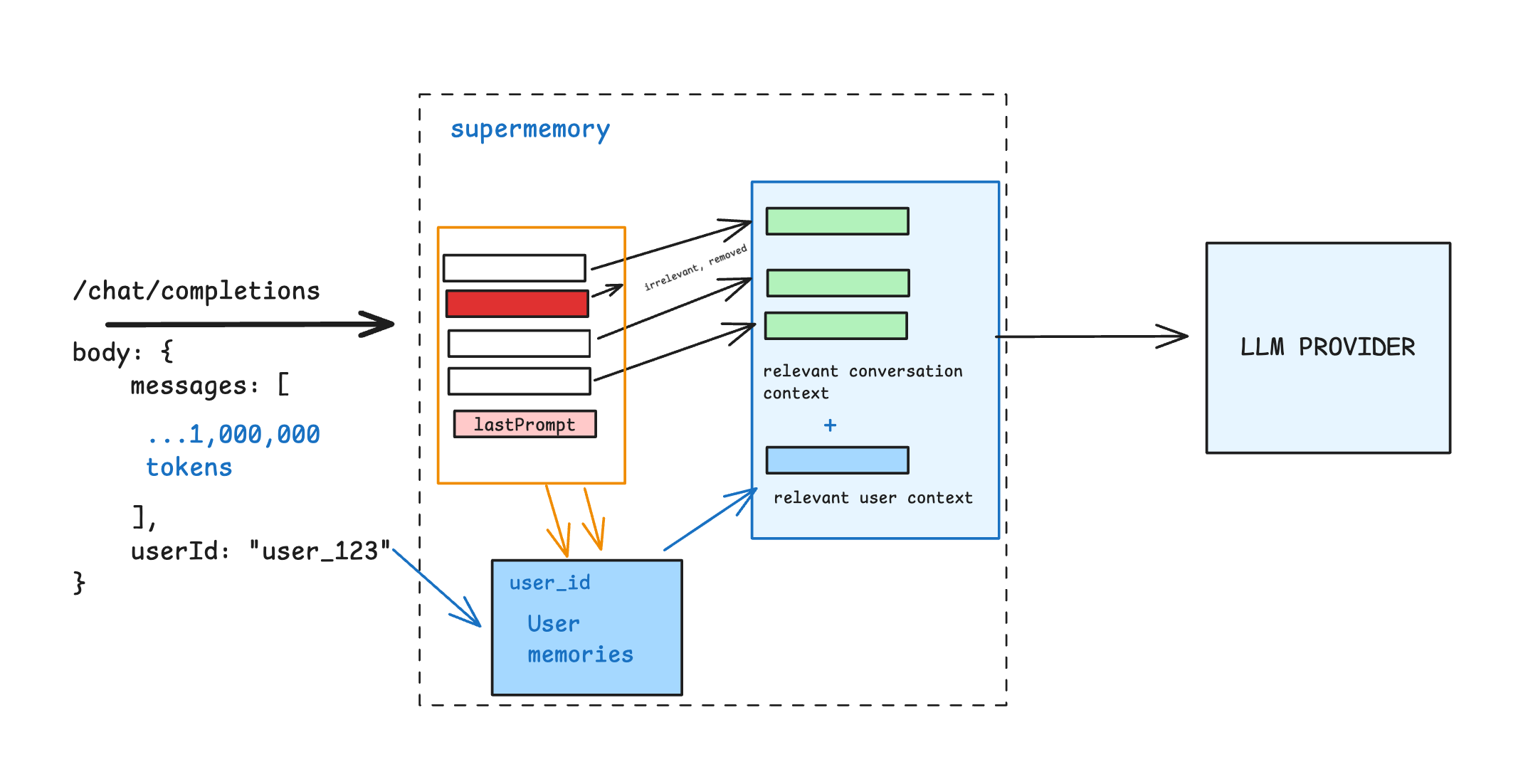 - No code refactoring - just swap the base URL with one provided by Supermemory. Read the quickstart to learn more.